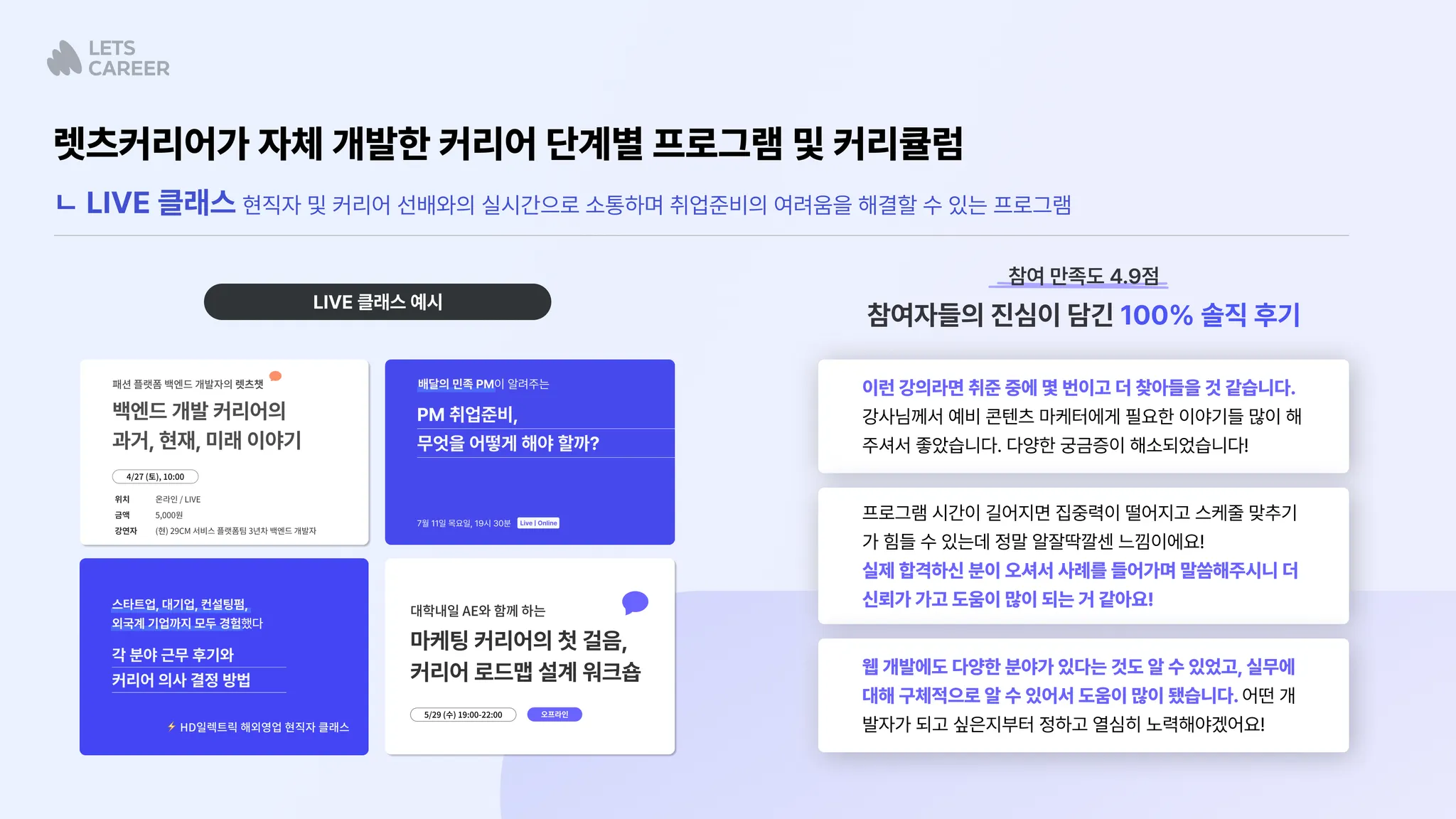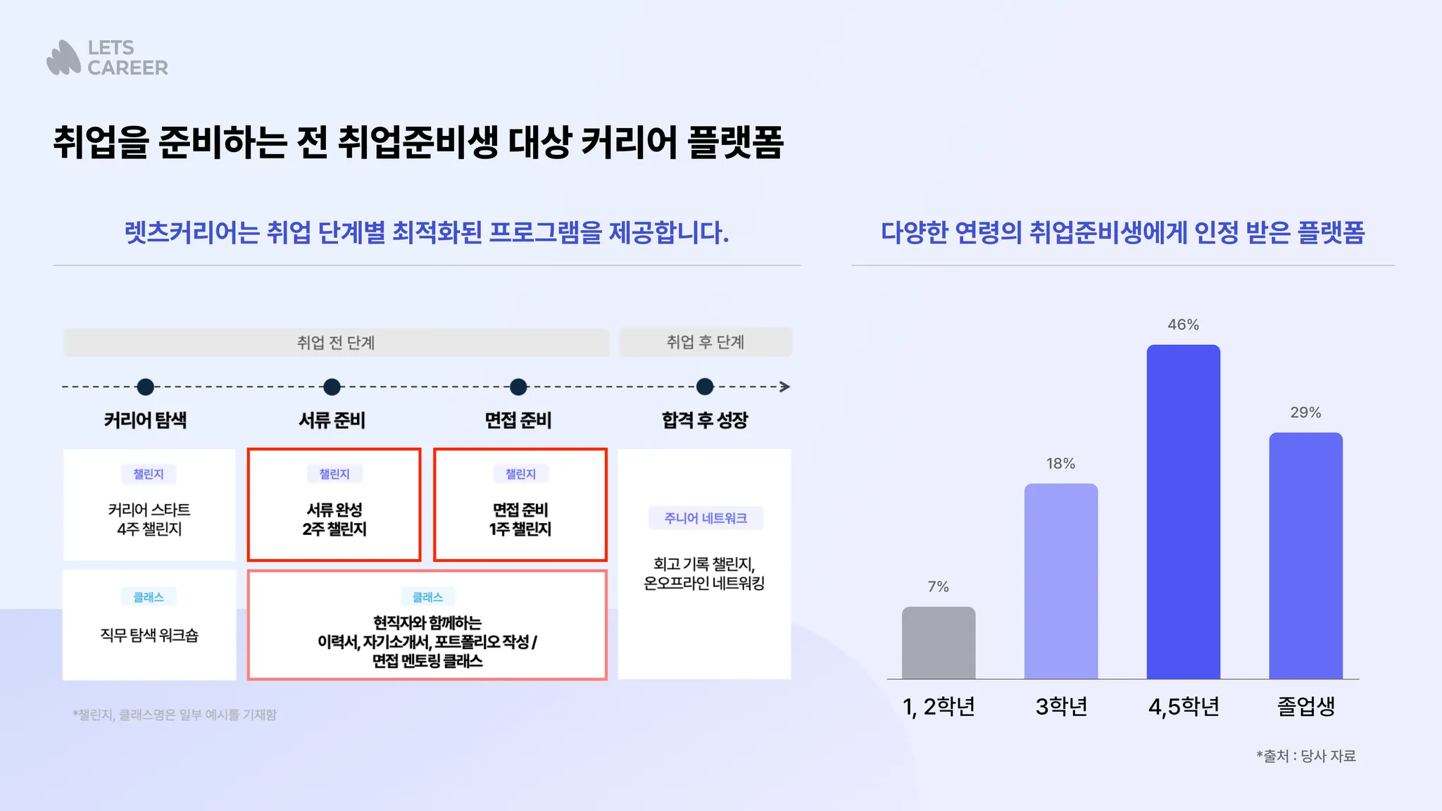 렛츠커리어는 ‘취업’을 선택하는 모든 취업준비생에게 도움이 될 단계별 커리큘럼을 가지고 있습니다.