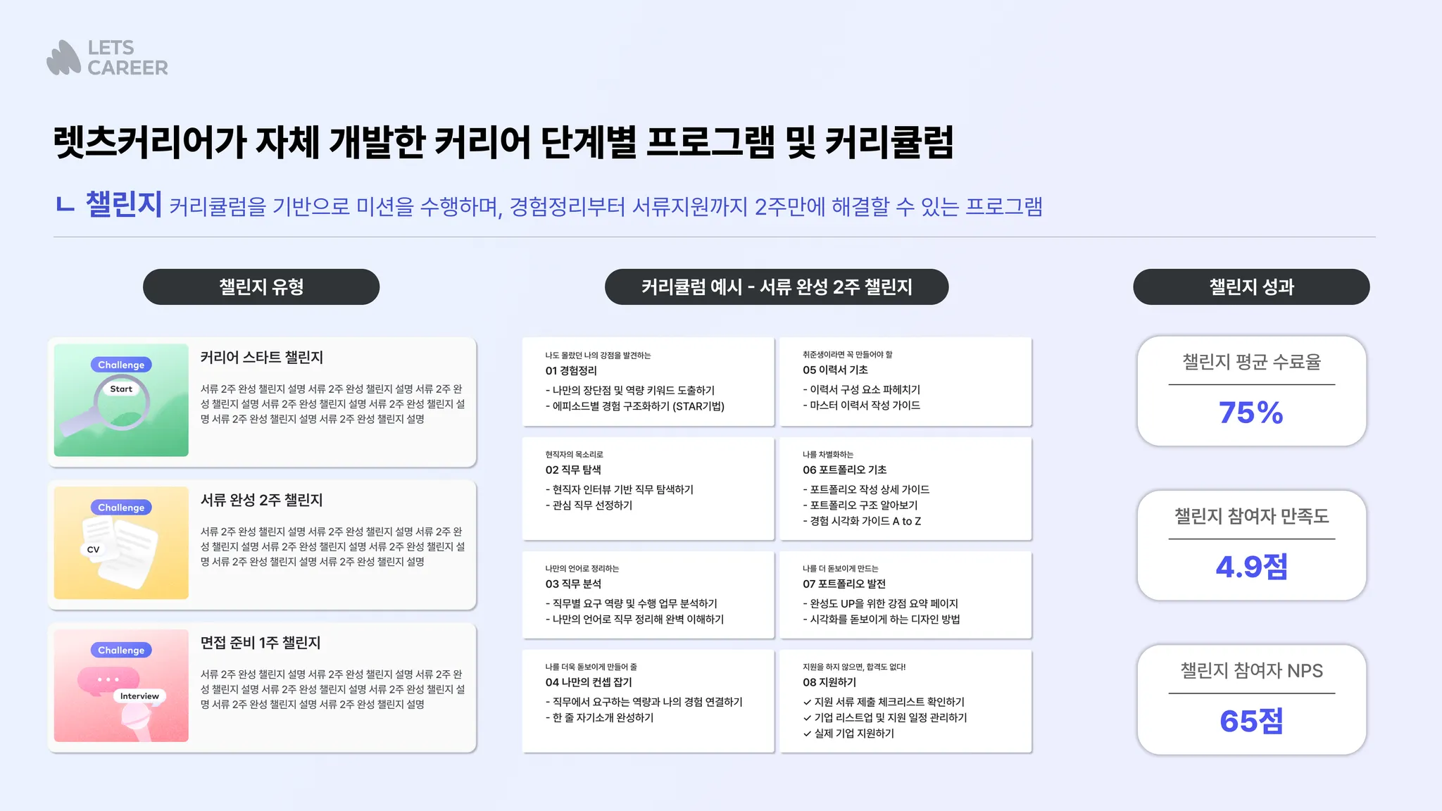 렛츠커리어의 대표 프로그램은 챌린지로, 경험정리-직무탐색-컨셉잡기를 통해, 2주 만에 이력서/자기소개서/포트폴리오를 완성할 수 있어요.
