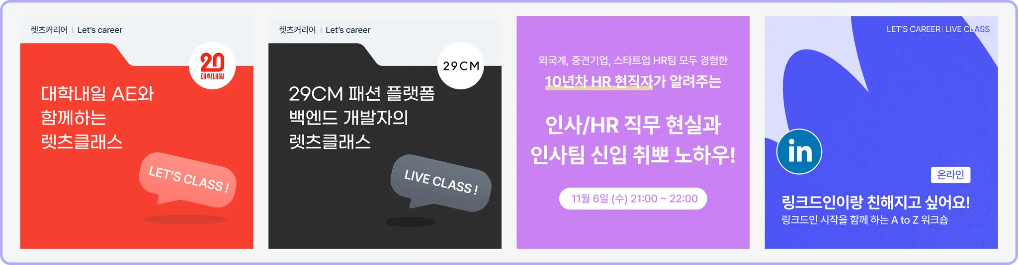 ๋ํ์ ๋ฐ ์ทจ์ค์์ ์ง๋ฌด ํ์์ ์ํด ๋ค์ํ ํ์ง์ ๋ผ์ด๋ธ ํด๋์ค๋ฅผ ์ด์ํ์ฌ, ์ปค๋ฆฌ์ด ์ ๋ฐฐ์ ์ค์๊ฐ์ผ๋ก ์ง๋ฌด ๊ด๋ จ ๊ณ ๋ฏผ ๋ฐ ์ปค๋ฆฌ์ด ๋ฐฉํฅ์ฑ์ ์ค์ ํ๋ ๊ฒ์ ๋์์ ๋๋ฆฌ๊ณ ์์ต๋๋ค.