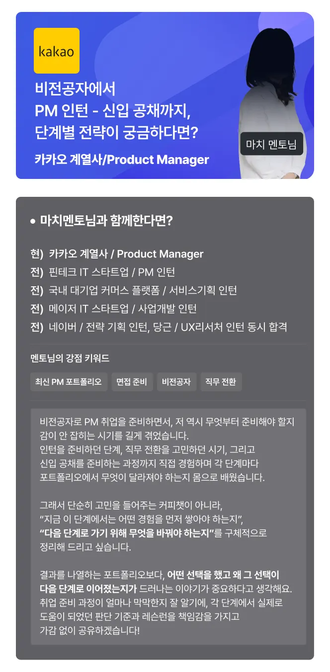 PM/PO/서비스 기획 직무를 희망하시는 분들을 카카오 계열사에서 근무 중인 현직 PM 두 분을 멘토로 모셨습니다